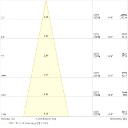 De gradenbundel geeft informatie over hoe breed het licht wordt uitgestraald. Dit zit tussen de 0 en 360 graden (D). Hoe kleiner de hoek, hoe specifieker de lichtbundel is. Over het algemeen is een smalle gradenbundel perfect voor sfeer- of accentverlichting, terwijl een brede gradenbundel ideaal is om grote oppervlaktes te verlichten.