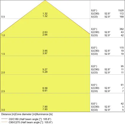 De gradenbundel geeft informatie over hoe breed het licht wordt uitgestraald. Dit zit tussen de 0 en 360 graden (D). Hoe kleiner de hoek, hoe specifieker de lichtbundel is. Over het algemeen is een smalle gradenbundel perfect voor sfeer- of accentverlichting, terwijl een brede gradenbundel ideaal is om grote oppervlaktes te verlichten.
