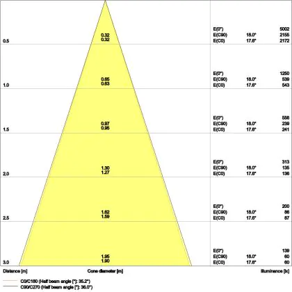 De gradenbundel geeft informatie over hoe breed het licht wordt uitgestraald. Dit zit tussen de 0 en 360 graden (D). Hoe kleiner de hoek, hoe specifieker de lichtbundel is. Over het algemeen is een smalle gradenbundel perfect voor sfeer- of accentverlichting, terwijl een brede gradenbundel ideaal is om grote oppervlaktes te verlichten.