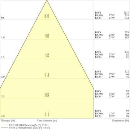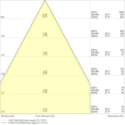 De gradenbundel geeft informatie over hoe breed het licht wordt uitgestraald. Dit zit tussen de 0 en 360 graden (D). Hoe kleiner de hoek, hoe specifieker de lichtbundel is. Over het algemeen is een smalle gradenbundel perfect voor sfeer- of accentverlichting, terwijl een brede gradenbundel ideaal is om grote oppervlaktes te verlichten.
