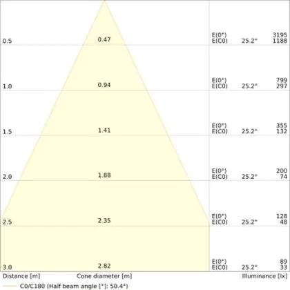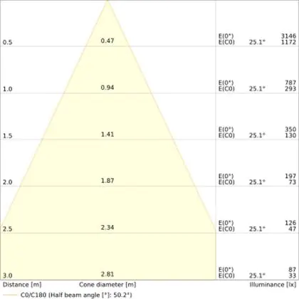 De gradenbundel geeft informatie over hoe breed het licht wordt uitgestraald. Dit zit tussen de 0 en 360 graden (D). Hoe kleiner de hoek, hoe specifieker de lichtbundel is. Over het algemeen is een smalle gradenbundel perfect voor sfeer- of accentverlichting, terwijl een brede gradenbundel ideaal is om grote oppervlaktes te verlichten.